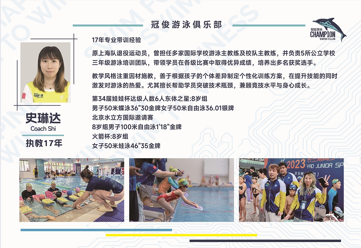 完整的教学体系,一站式服务,从婴儿到冠军之路尽在CHAMPION,真正的冠军就是冠俊教练的团队,拥有澳洲ASCTA认证证书,中国教练资质,团队成员均为前国家队,省队优秀游泳运动员,且有多年丰富的教学经验。